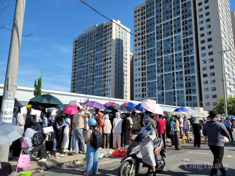 Hàng dài người dân xếp hàng từ trong văn phòng ra đến tận ngoài đường, đứng giữa nắng nóng đợi đến lượt nộp hồ sơ mua nhà.