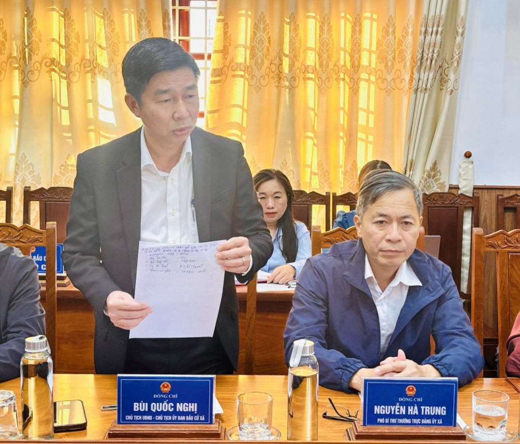 | Lãnh đạo xã Hội Sơn báo cáo tại buổi làm việc |