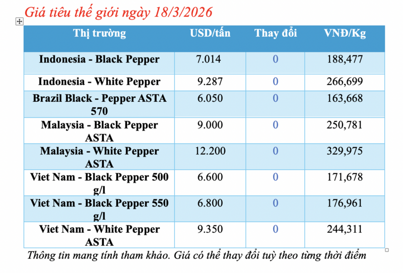 Giá tiêu thế giới hôm nay: Không biến động