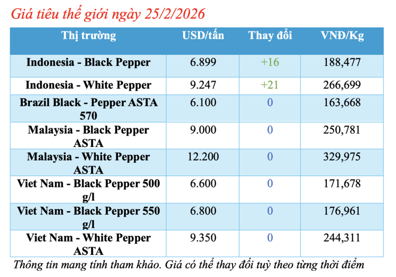 Cập nhật giá tiêu thế giới từ Hiệp hội Hồ tiêu Quốc tế (IPC) sáng 25/2/2026, hồ tiêu xuất khẩu hôm nay ghi nhận biến động mới từ thị trường Indonesia. Các thị trường khác đều duy trì mức giá ổn định so với phiên giao dịch trước.