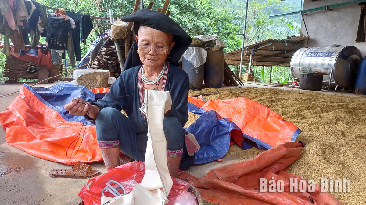 Bà Phùng Thị Thanh, xóm Suối Bến, xã Liên Sơn (Lương Sơn) còn giữ gìn được nghề thêu thổ cẩm trang phục dân tộc Dao.