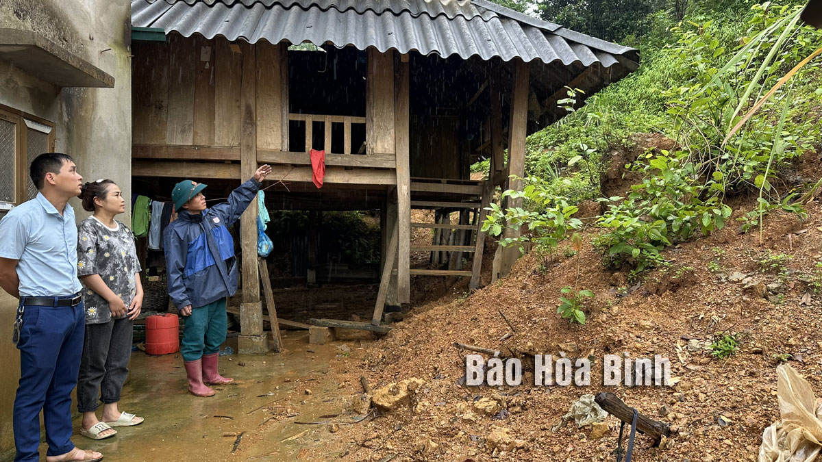 Lực lượng chức năng khảo sát thực tế tại hộ chị Nguyễn Thị Lệ, xóm Nọt, xã Sơn Thủy (Mai Châu) bị sạt lở đất do ảnh hưởng của bão số 3.