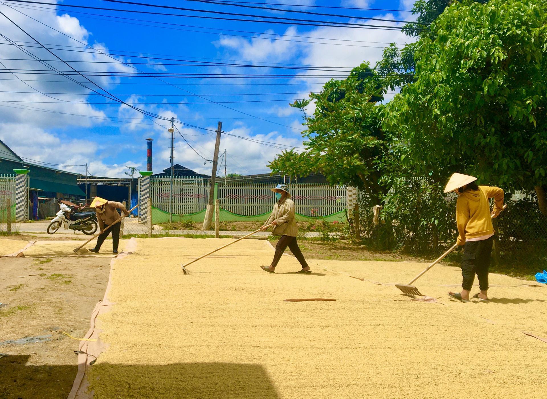 | Gia đình bà H'Srông Ông (buôn Bàng, xã Đắk Liêng) đang phơi lúa sau khi thu hoạch. |