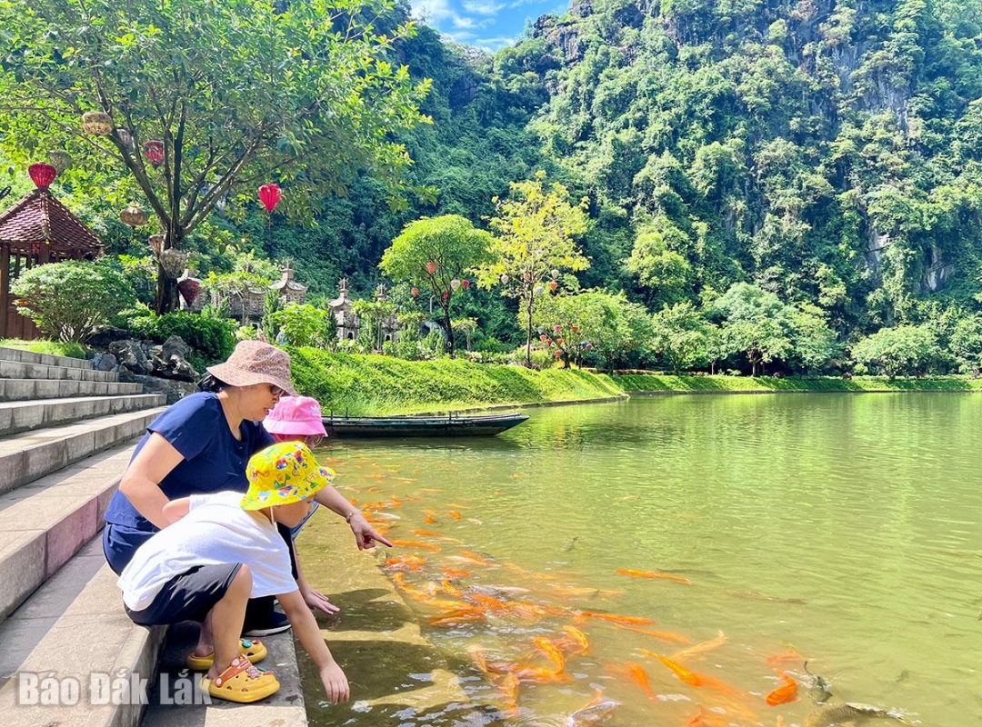 Du khách, đặc biệt là các bạn nhỏ thích thú vui đùa với những đàn cá nơi đây. |