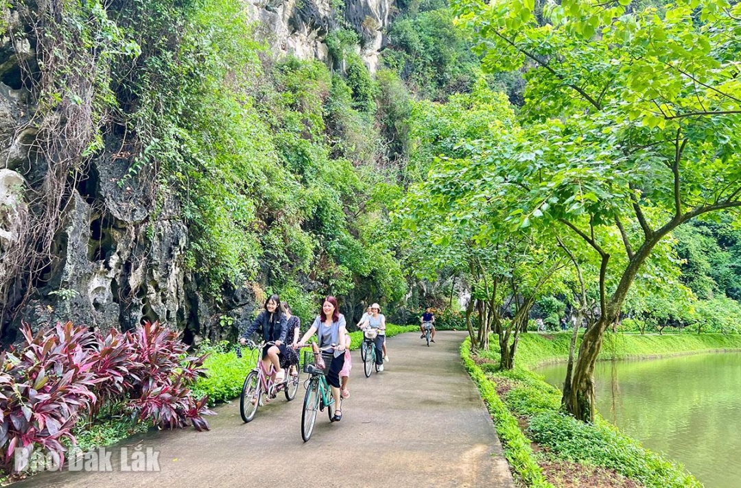 Du khách thích thú đạp xe len lỏi trong không gian mát mẻ và đầy thơ mộng. |