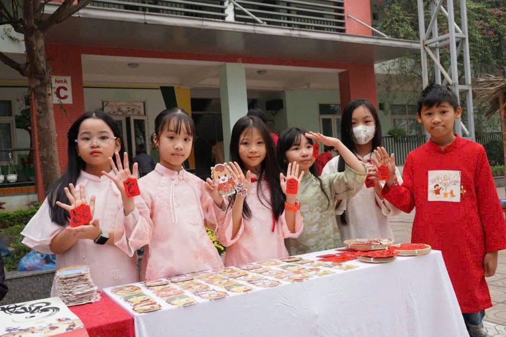 Khối Văn - Thể - Mỹ: Gian hàng viết chữ thư pháp, làm thiệp chúc Tết.