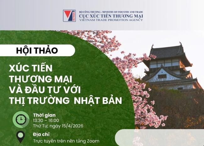 Chương trình diễn ra từ 13h30 đến 16h00, thứ Tư, ngày 15/4/2026. Địa điểm trực tiếp tại phòng họp tầng 4, Cục Xúc tiến thương mại, 20 Lý Thường Kiệt, phường Cửa Nam (Hà Nội) kết hợp trực tuyến trên nền tảng zoom.
