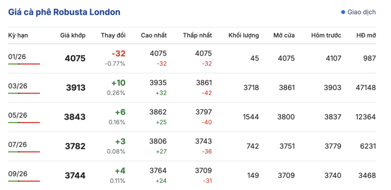 Kết thúc phiên giao dịch gần nhất, giá cà phê Robusta tại London tăng giảm trái chiều trong các kỳ giao hàng. Cụ thể, kỳ giao tháng 1/2026 giảm 32 USD/tấn, xuống mức 4075 USD/tấn. Trong khi đó, hợp đồng giao kỳ hạn tháng 9/2026 lại tăng nhẹ 4 USD/tấn, đạt mức 3744 USD/tấn.