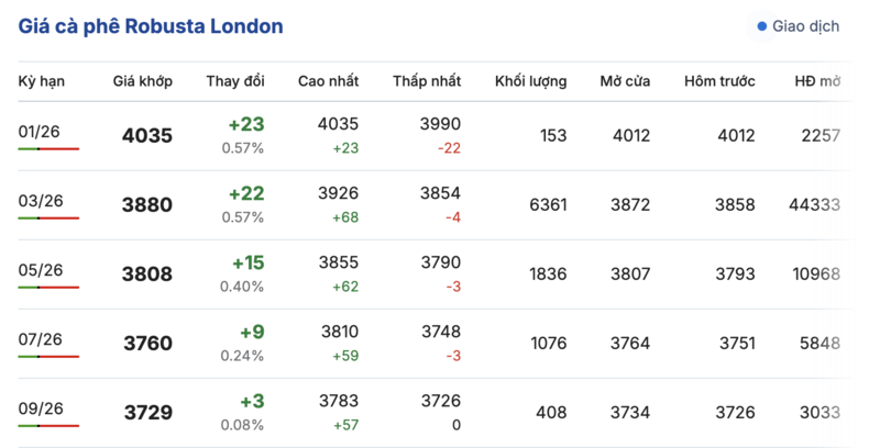 Kết thúc phiên giao dịch gần nhất, giá cà phê Robusta tại London tiếp tục tăng nhẹ đồng loạt trong các kỳ giao hàng. Cụ thể, kỳ giao tháng 1/2026 tăng 23 USD/tấn, lên mức 4035 USD/tấn. Hợp đồng giao kỳ hạn tháng 9/2026 tăng 3 USD/tấn, lên mức 3729 USD/tấn.
