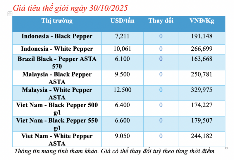 Cập nhật giá tiêu thế giới từ Hiệp hội Hồ tiêu Quốc tế (IPC) lúc 4 giờ 30 phút sáng 30/10/2025, thị trường hồ tiêu xuất khẩu hôm nay không ghi nhận biến động. Các thị trường đều ổn định giá so với hôm qua.
