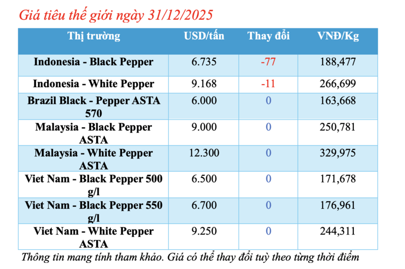 Cập nhật giá tiêu thế giới từ Hiệp hội Hồ tiêu Quốc tế (IPC) sáng 31/12/2025, hồ tiêu xuất khẩu hôm nay ghi nhận biến động tại thị trường Indonesia. Các thị trường đều ổn định giá so với phiên giao dịch hôm qua.